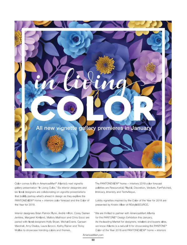 Publications, Blog Posts and Newsletters to Inform, Entertain and ENCOURAGE ACTION "Green is the New Black" Editorial for AmericasMart Magazine "In Living Color" Editorial for AmericasMart Magazine "Home Stager's Guide to AmericasMart" for Portman + Peachtree Blog "Preparing for Market at 39,000 Feet" for Portman + Peachtree Blog